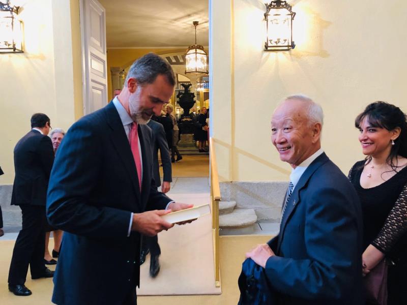 26日下午,西班牙国王菲利佩六世在埃尔巴尔多王宫举行仪式,隆重纪念并表彰国际西班牙语研究事业。出席仪式的有西班牙王室成员、西班牙科学、创新与大学事务大臣、各国驻西班牙大使等。仪式后,董燕生教授向国王赠送了《堂吉诃德》中译本,国王也回忆起当年向董燕生教授授予“伊莎贝尔女王”勋章的场景。