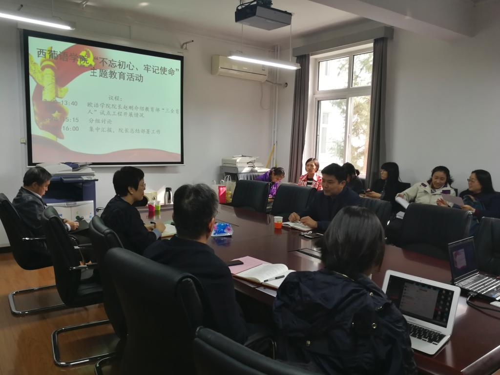 为深入学习贯彻习近平新时代中国特色社会主义思想和党的十九大精神,落实“不忘初心、牢记使命”主题教育要求,1023日(周三)下午,西葡语学院党支部召开“立德树人”专题学习讨论活动,西葡语学院全体教职工参加,党总支常务副书记孙眉主持。